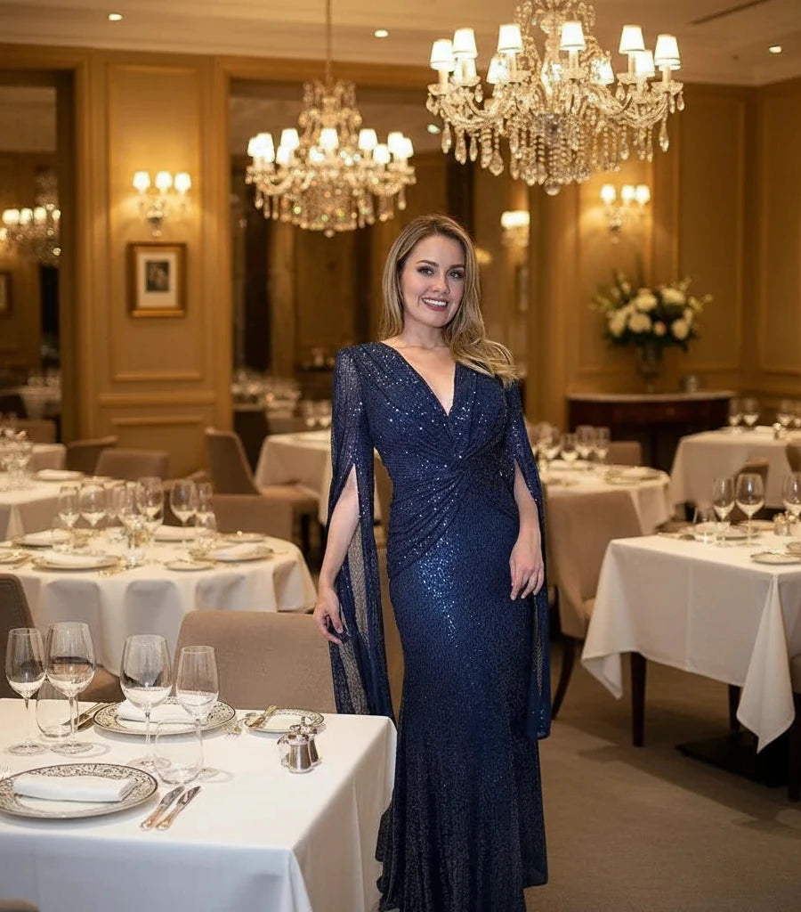 Turn heads in this captivating sequin gown, your go-to choice for proms, galas, and formal celebrations. This floor-length dress combines artistic flair with refined elegance through its striking V-neckline, graceful full sleeves, and impeccable sheath silhouette. Constructed from premium polyester with subtle elasticity, it moves with you while maintaining a polished appearance. The natural waistline accentuates your silhouette, while decorative zippers and intricate tatting details add contemporary sophistication. The convenient pullover closure means effortless dressing for maximum confidence. Slip into this ankle-length masterpiece and experience the perfect balance of comfort, style, and glamour that will make your special night truly unforgettable.