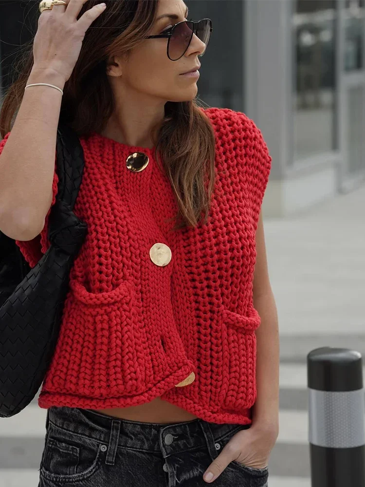 Discover the perfect blend of style and comfort with this knit vest from our fashionable collection. Featuring a single-breasted closure, regular length, and O-neck collar, this vest exudes elegance and sophistication. The intricate button, cut out, and crochet details add a touch of charm, while the solid pattern complements any look. This vest is designed to keep you warm and stylish throughout the Autumn/Winter season.