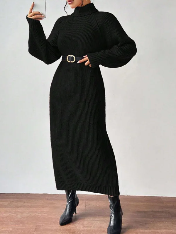This knit turtleneck dress features a straight silhouette with full-length sleeves and a pullover design, perfect for autumn and winter. Crafted from slightly stretchy polyester, it offers a comfortable regular fit with a natural waistline and ankle-length cut. The dress’s minimalist style provides a refined option for casual or office wear, combining warmth and elegance effortlessly.